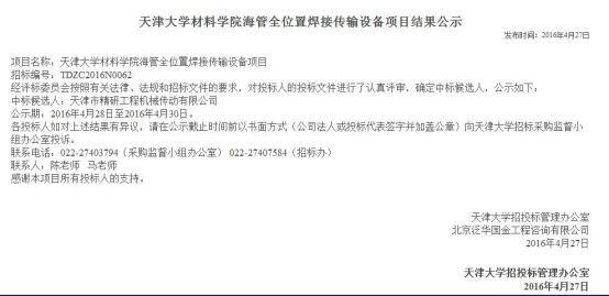 繼為天津(jin)大學研(yan)制水下摩擦焊機裝置成(cheng)功(gong)海(hai)試后,我公司又中標天津(jin)大學材料學院海(hai)管全位置焊接(jie)傳輸(shu)設備項目,標志(zhi)著我們(men)與高校的全面合作邁(mai)入了(le)一個新階段(duan)。